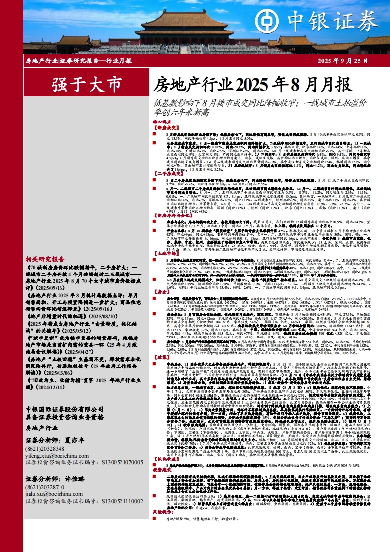2025-09-25-中银证券--房地产行业2025年8月月报:低基数影响下8月楼市成交同比降幅收窄;一线城市土拍溢价率创六年来新高