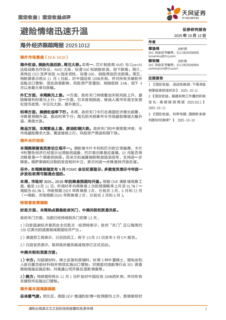 2025-10-13-天风证券-海外经济跟踪周报:避险情绪迅速升温