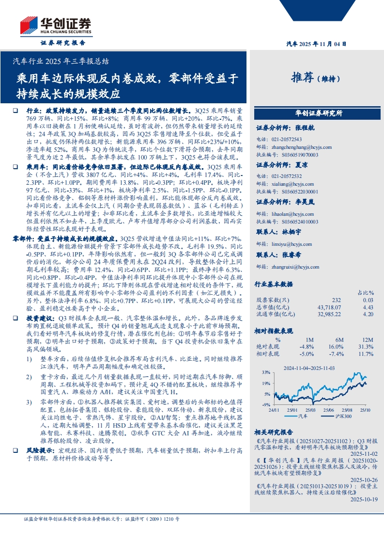 汽车行业2025年三季报总结:乘用车边际体现反内卷成效,零部件受益于持续成长的规模效应