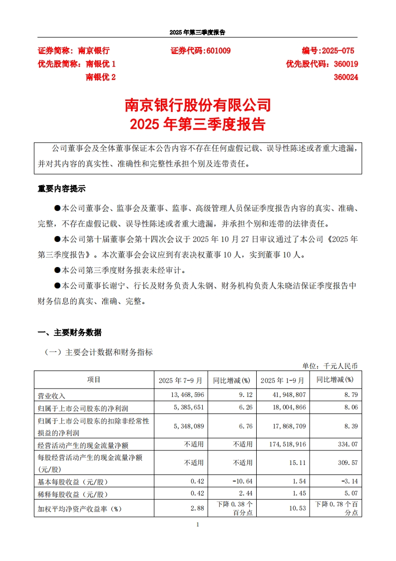 2025-11-29-南京银行股份有限公司2025年第三季度报告