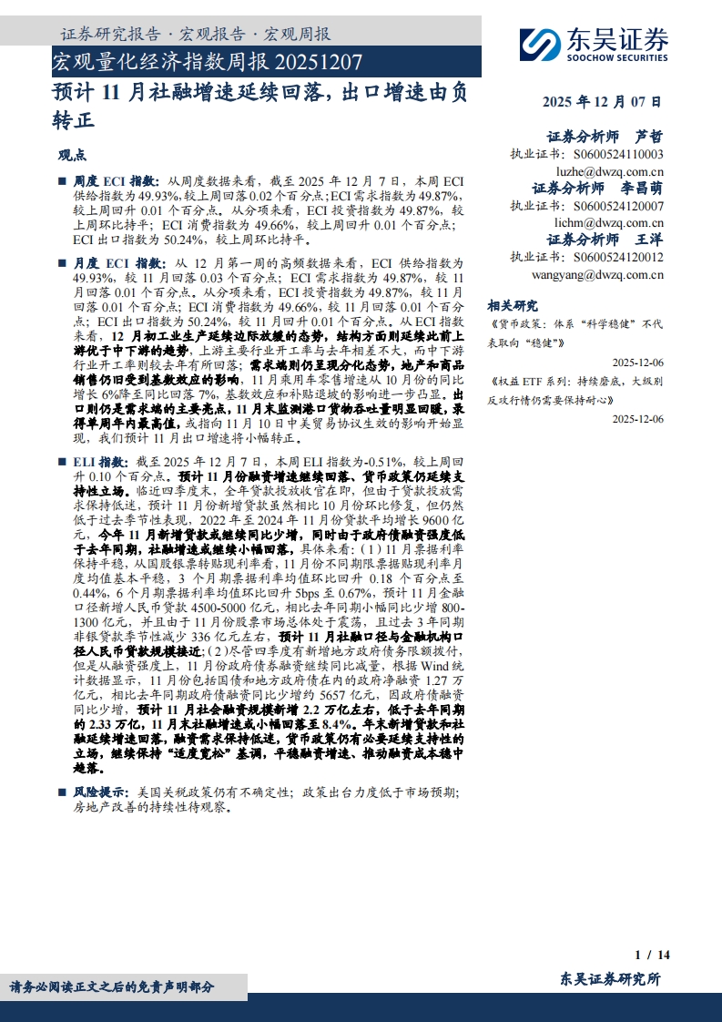 2025-12-07-东吴证券-宏观量化经济指数周报:预计11月社融增速延续回落,出口增速由负转正