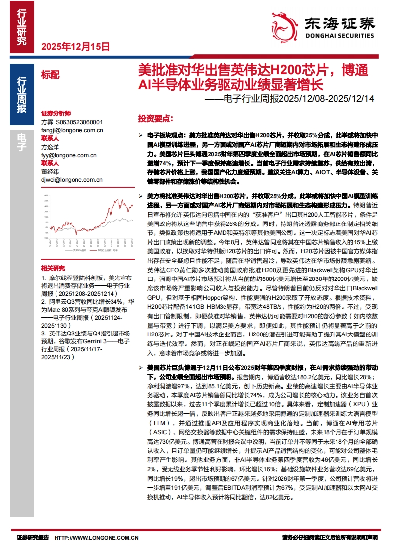 2025-12-15-东海证券--电子行业周报:美批准对华出售英伟达H200芯片,博通AI半导体业务驱动业绩显著增长