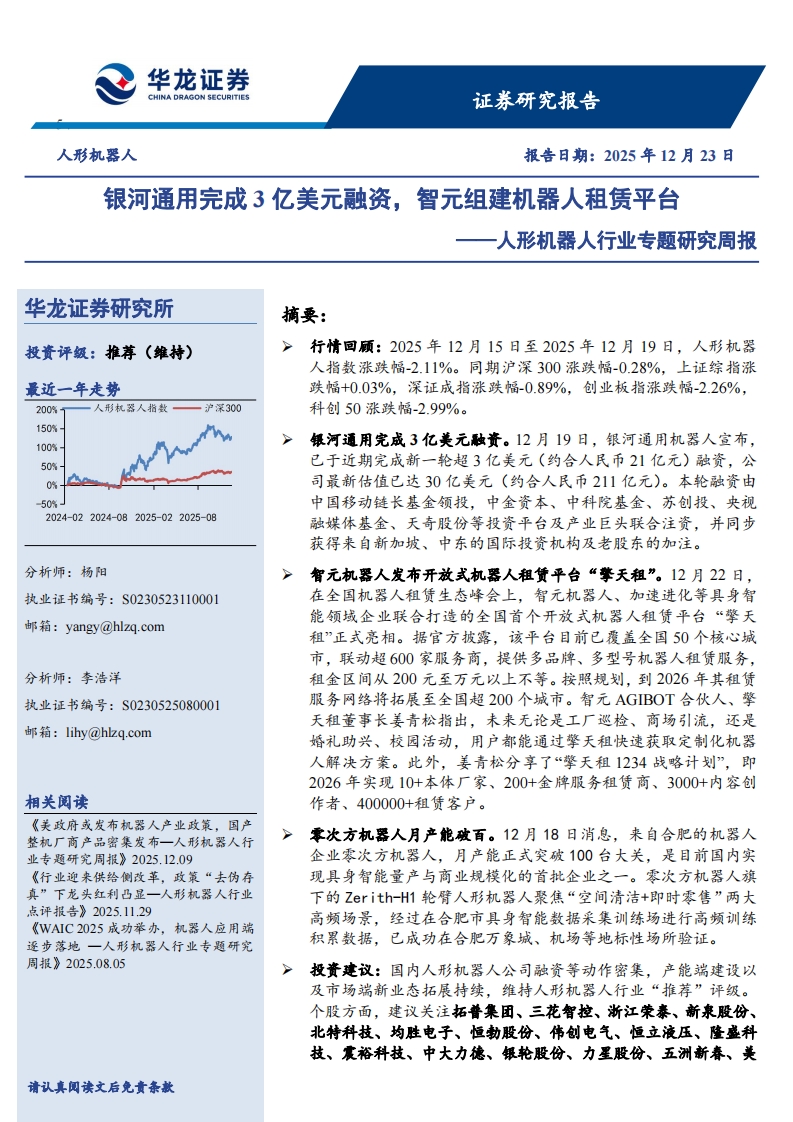 2025-12-23-华龙证券--人形机器人行业专题研究周报:银河通用完成3亿美元融资,智元组建机器人租赁平台