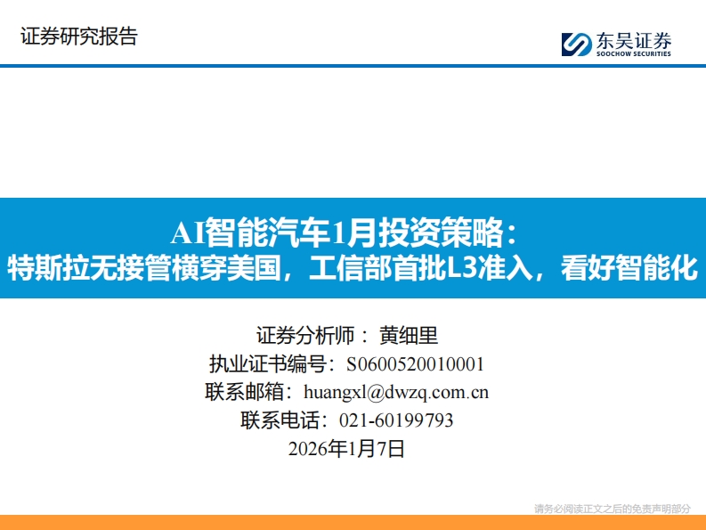 2026-01-07-东吴证券--AI智能汽车1月投资策略:特斯拉无接管横穿美国,工信部首批L3准入,看好智能化