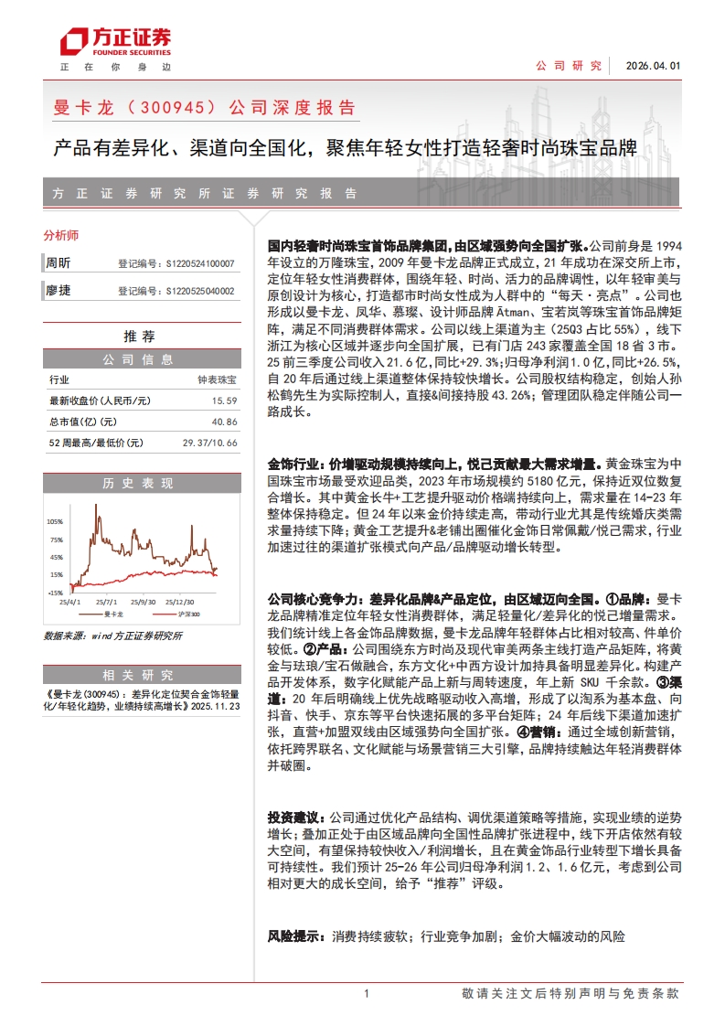20260401-方正证券-方正证券-曼卡龙(300945)公司深度报告:产品有差异化、渠道向全国化,聚焦年轻女性打造轻奢时尚珠宝品牌(28页)
