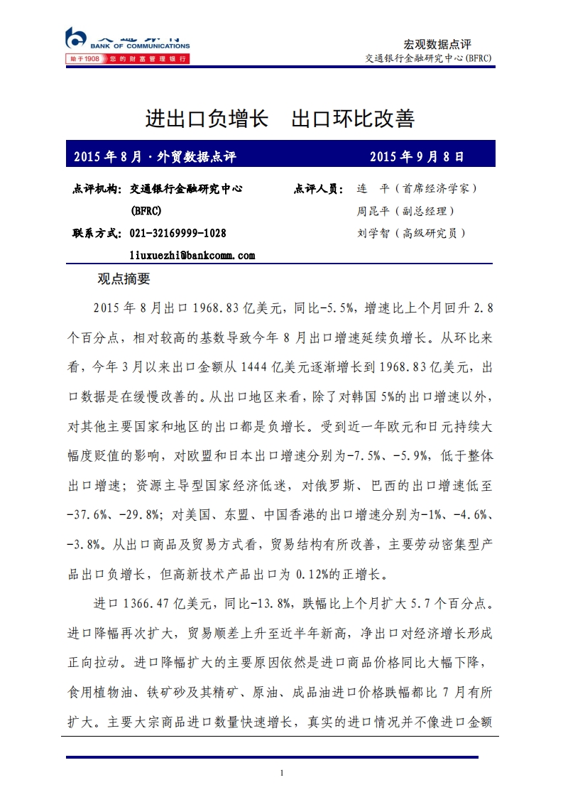 20150908-:-交通银行-2015年8月外贸数据点评-进出口负增长,出口环比改善-7页