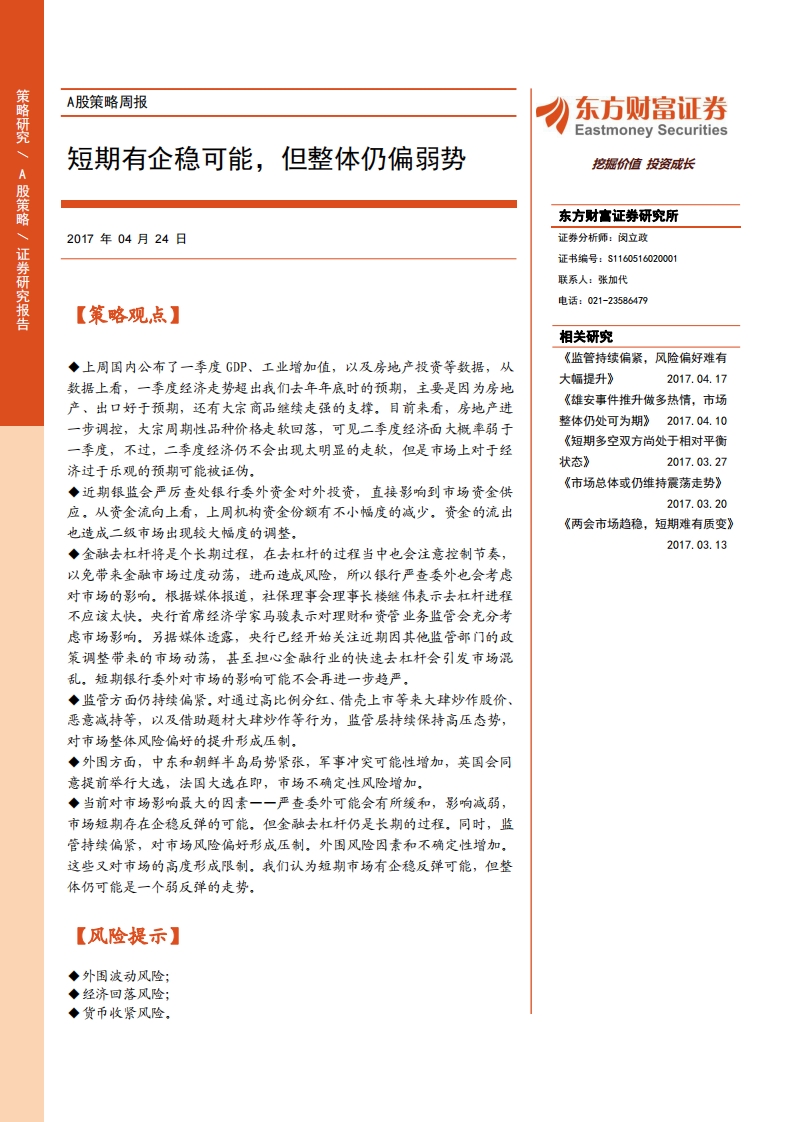 20170424-财富证券:东方-A股策略周报-短期有企稳可能,但整体仍偏弱势-18页