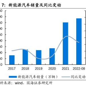 图7展示了新能源汽车的销量及同比变动情况。可以清楚地看到新能源汽车市场的发展趋势。